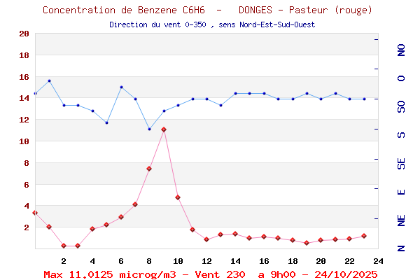 Pour ce polluant, il ne s’agit pas d’élévations associées à l’orientation des vents, mais d’un niveau moyen plus élevé de 50% par rapport aux stations de Saint-Nazaire – Blum, Parc Paysager – qui sont éloignées de la zone industrielle. En fait 37% quand on fait le rapport entre 11 et 8µg/m3 .